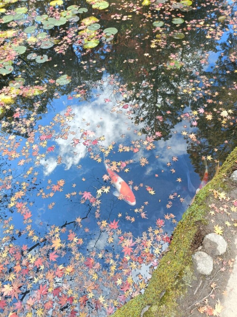 池の空ともみじの星の中を鯉が泳いでいます✨