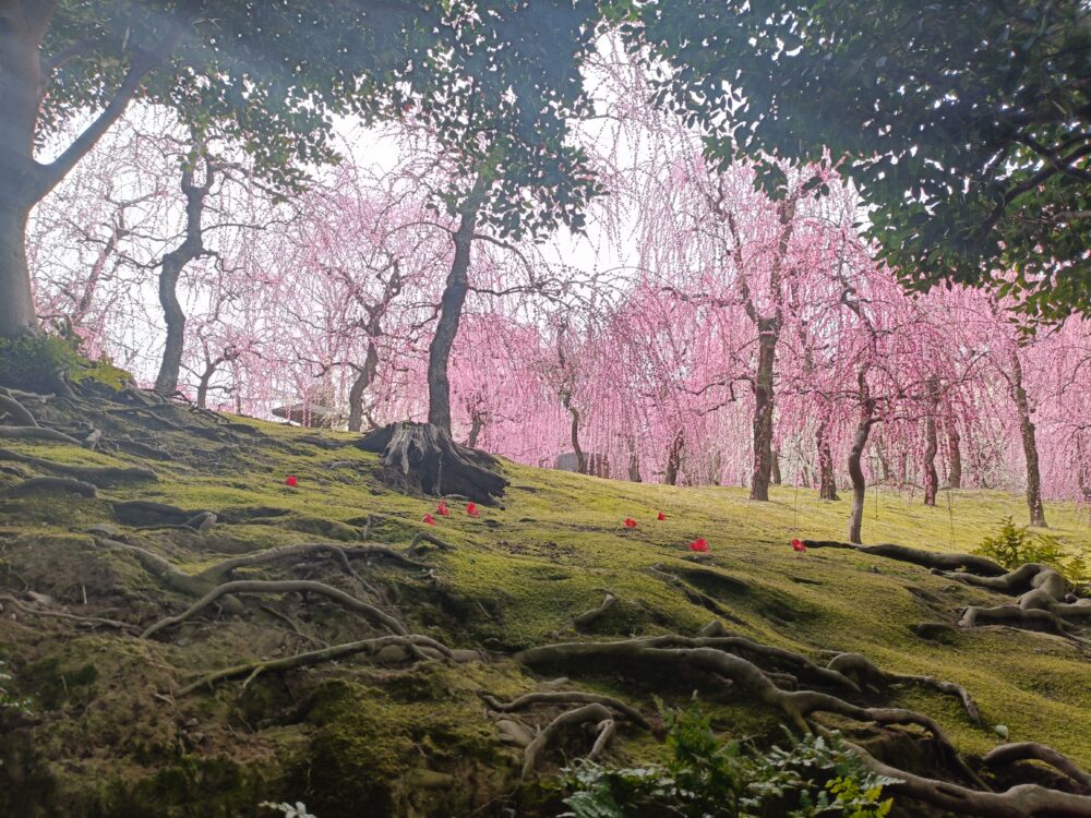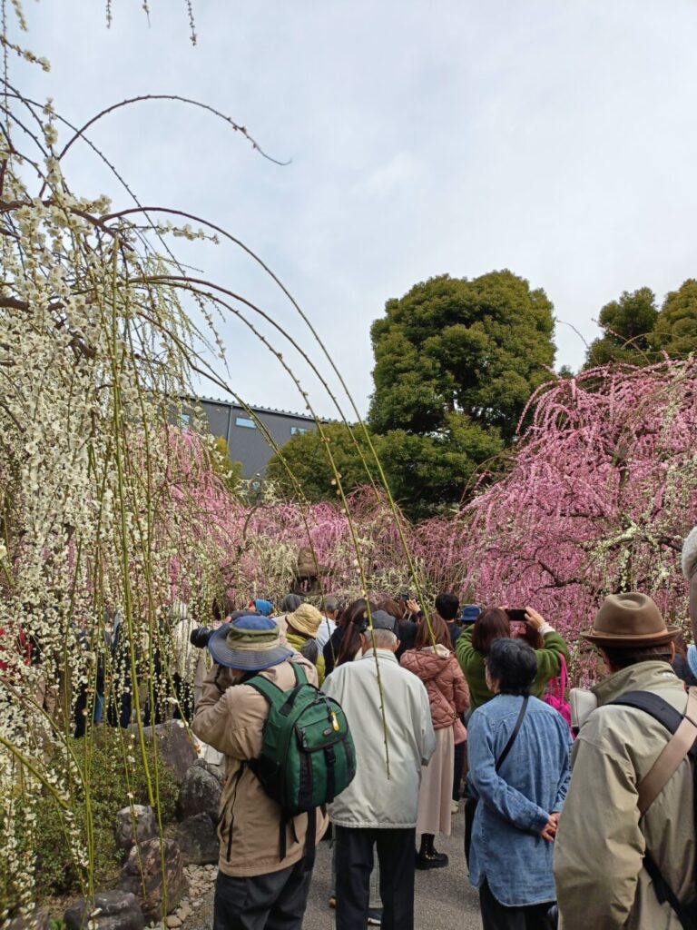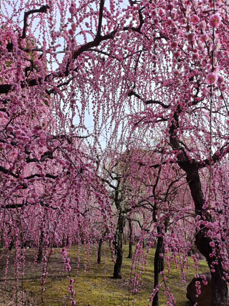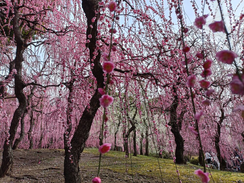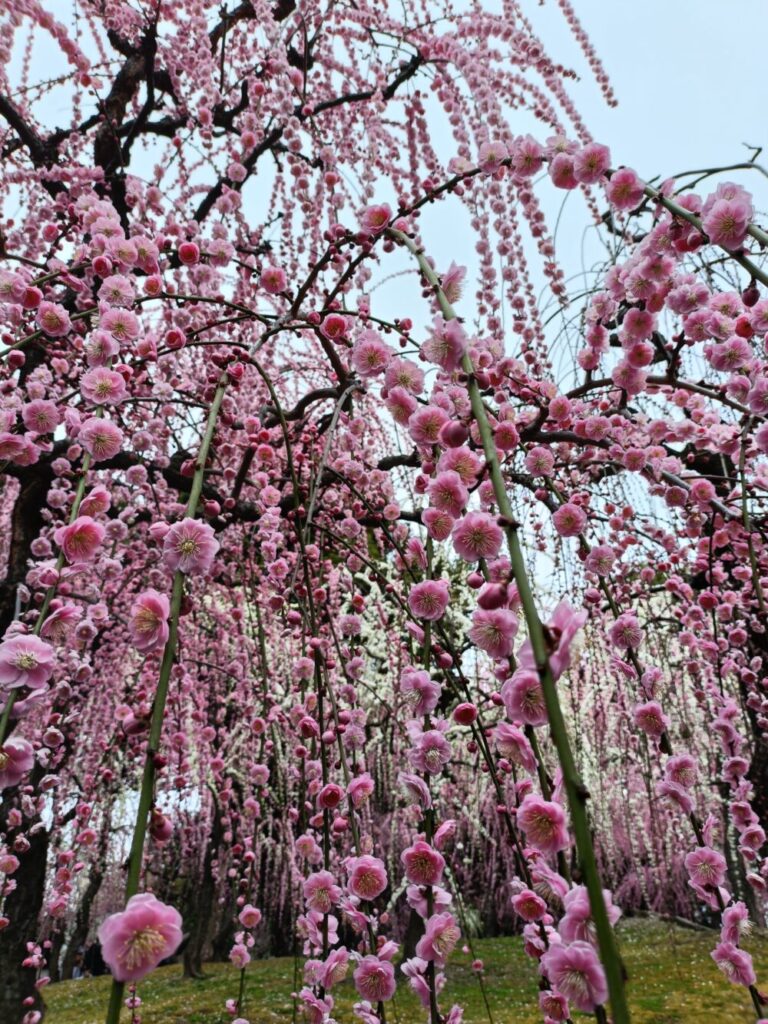 150本のしだれ梅が薄紅色や紅白の花を装い、