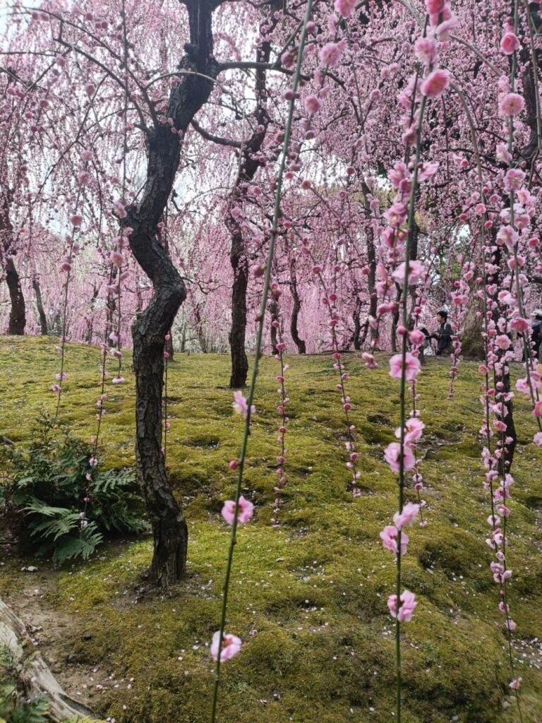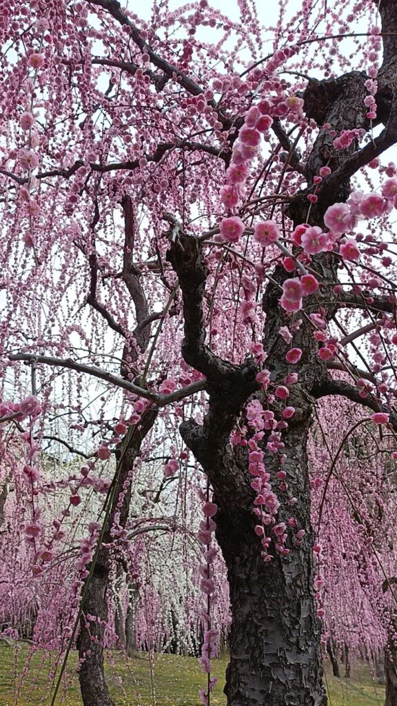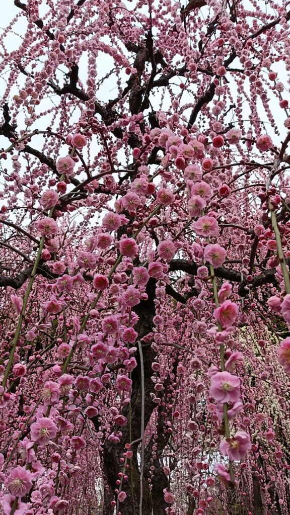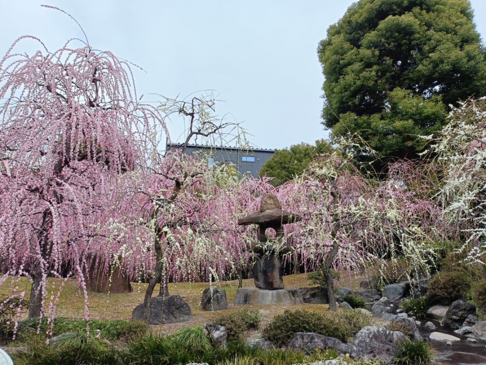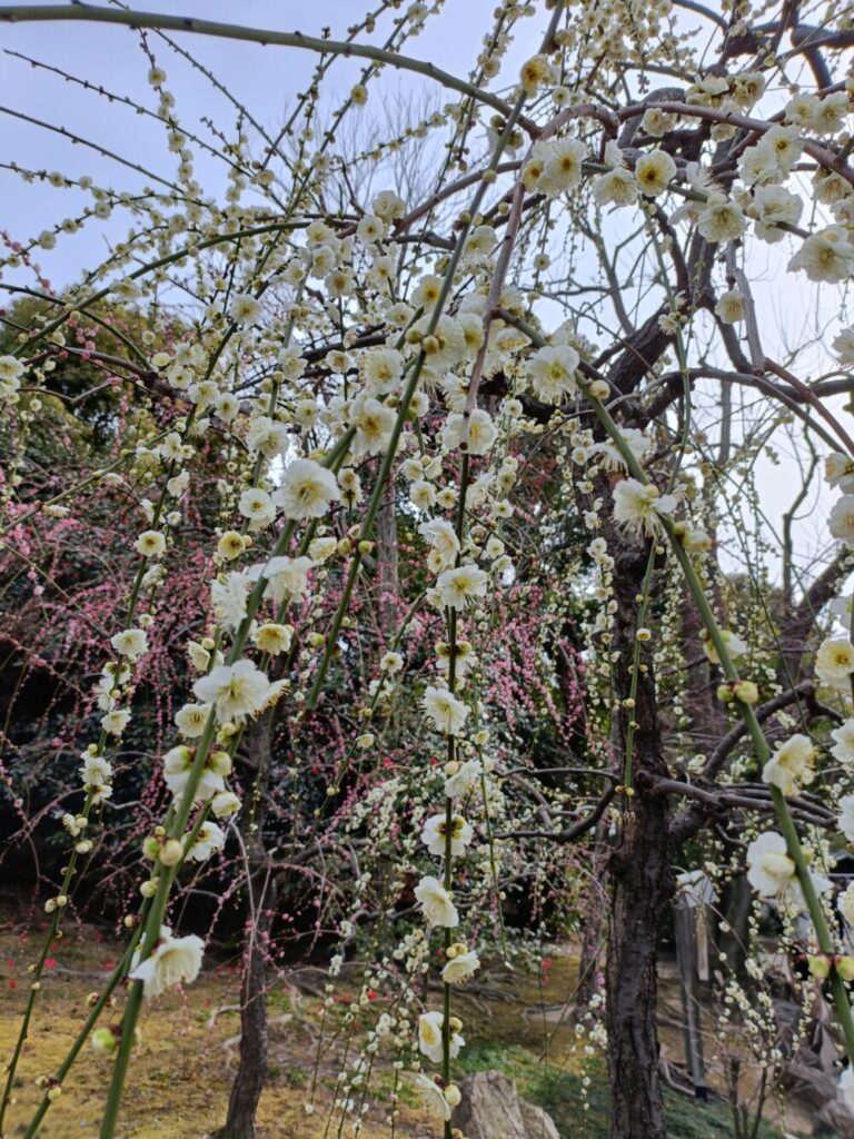 150本のしだれ梅が薄紅色や紅白の花を装い、