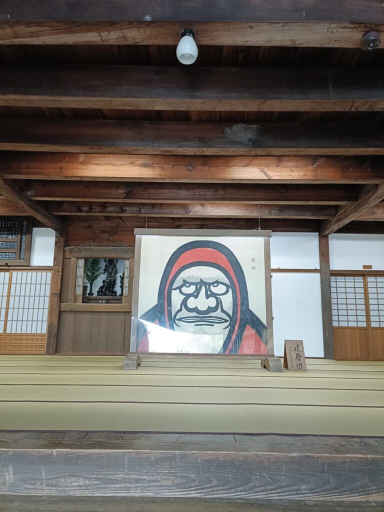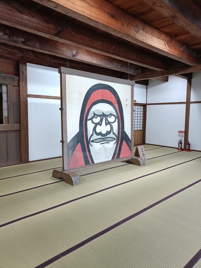 庫裏の正面玄関に置かれた衝立には、独特なタッチの達磨大師の絵、