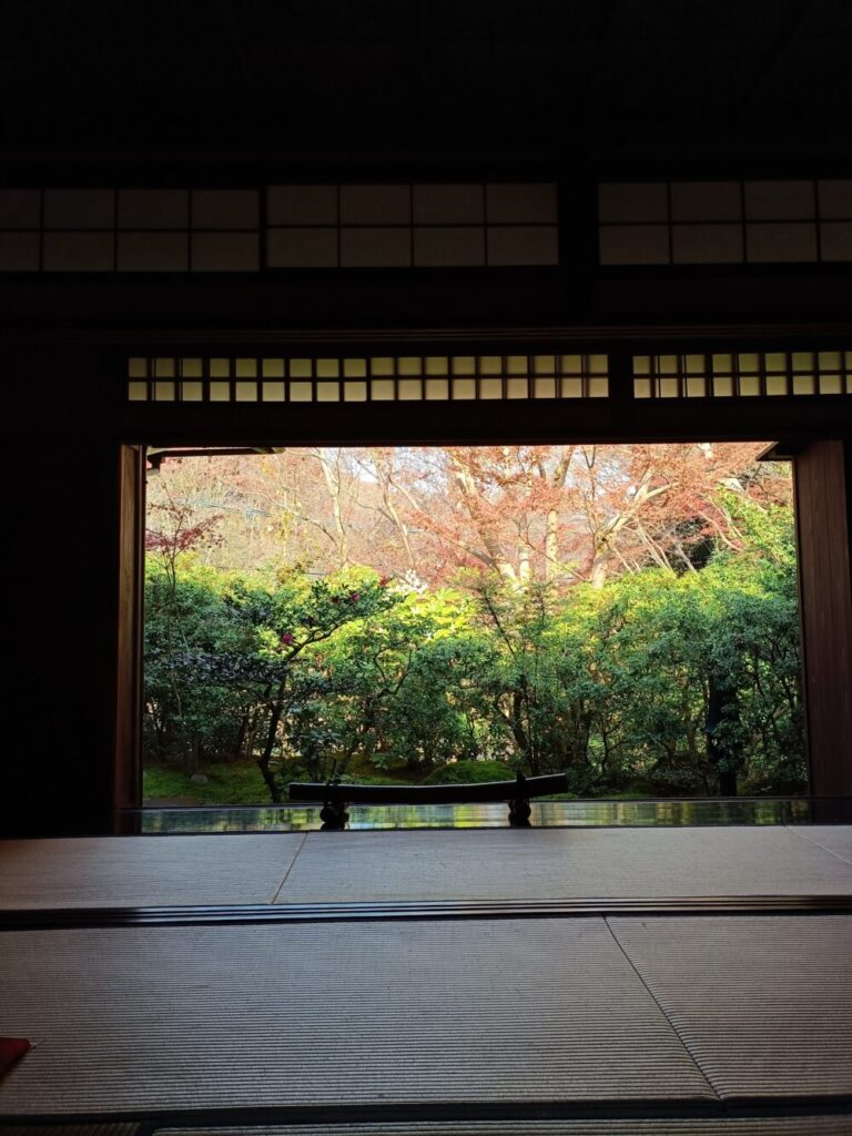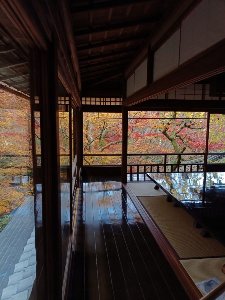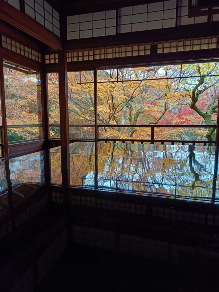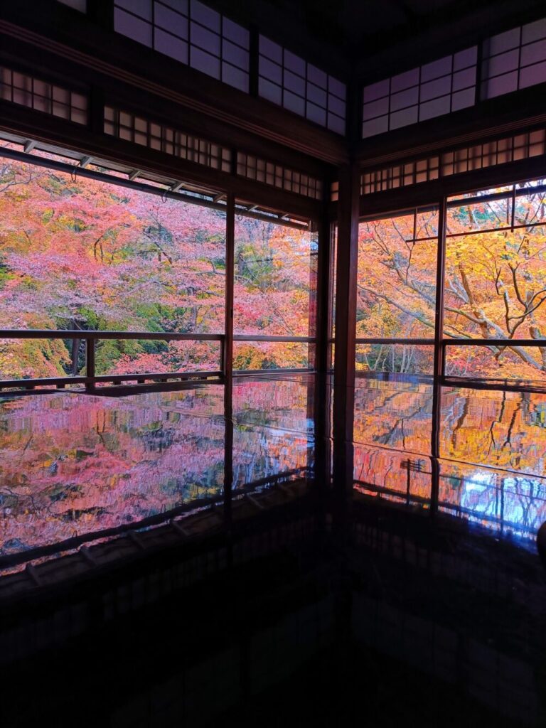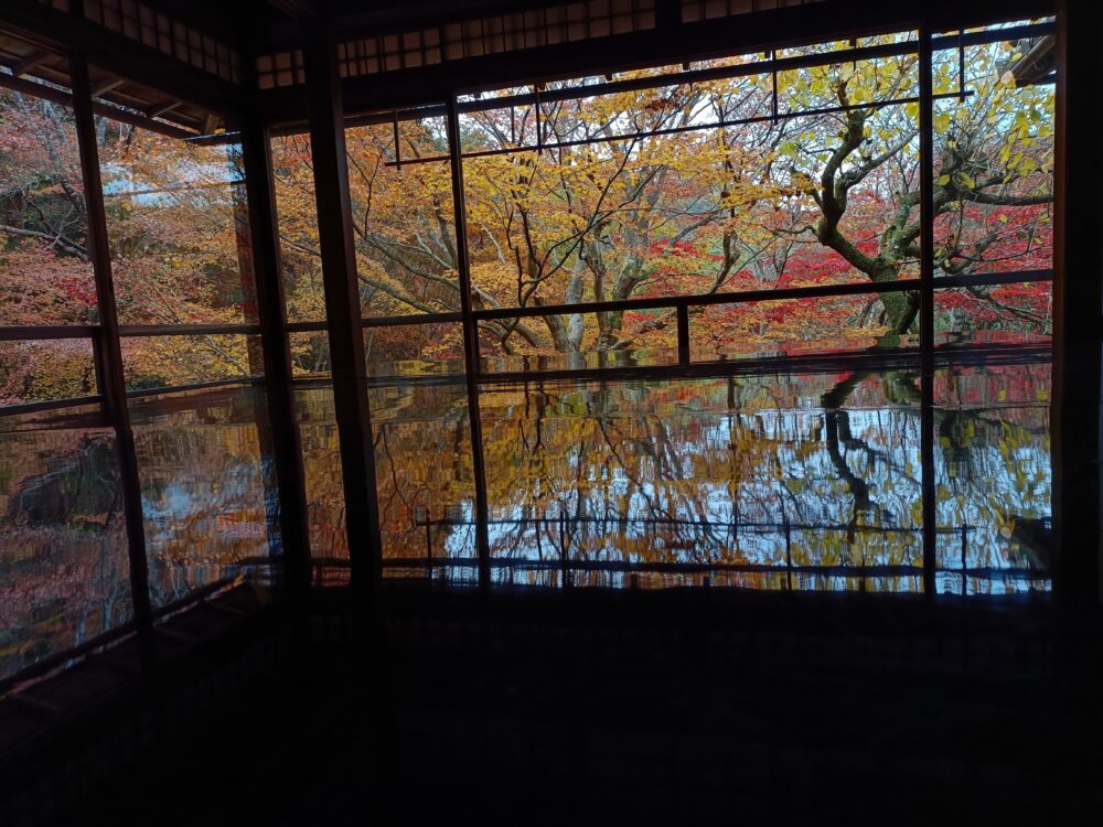 書院2階の机の庭の楓が映り込む光景は圧巻です✨