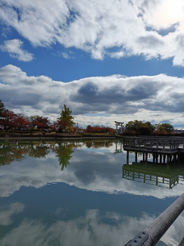 豊かな池を二分する中堤は参道として使われています。